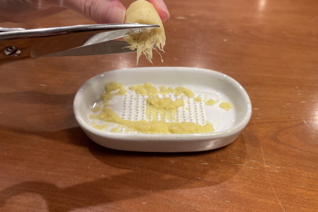 しょうがをおろしている途中で、まだすりおろしていないしょうがの方に繊維がでてきます。それをキッチンバサミなどで切ると、またすりおろしやすくなります。