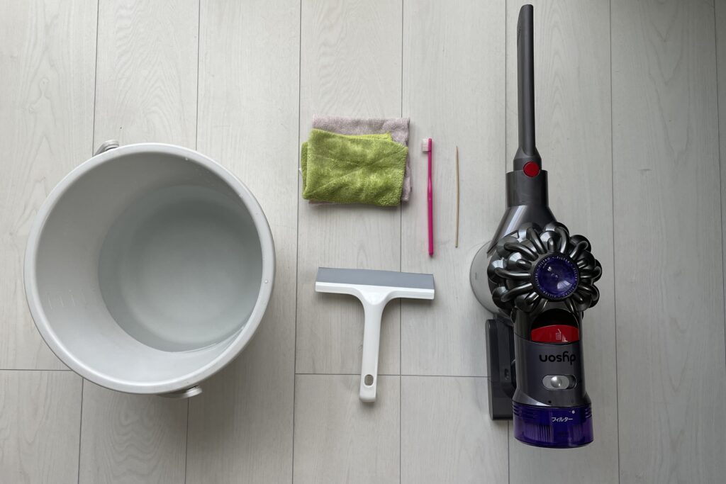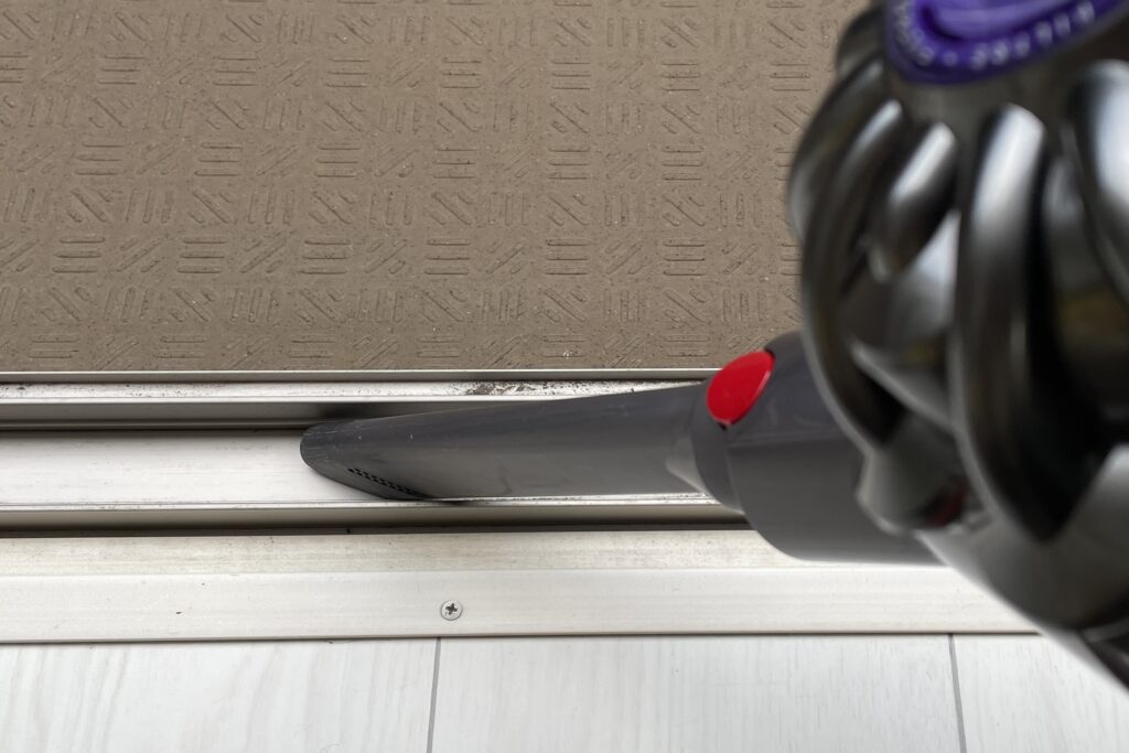 サッシの汚れは濡れると固まって拭き取りずらいため、最初に掃除機で吸っておきます。