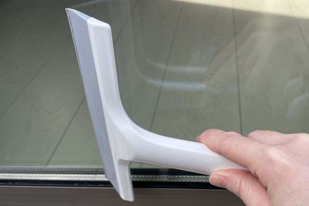 洗ったマイクロファイバークロスで窓ガラスを拭いて、スクイジーを横に掛け水を切ります。