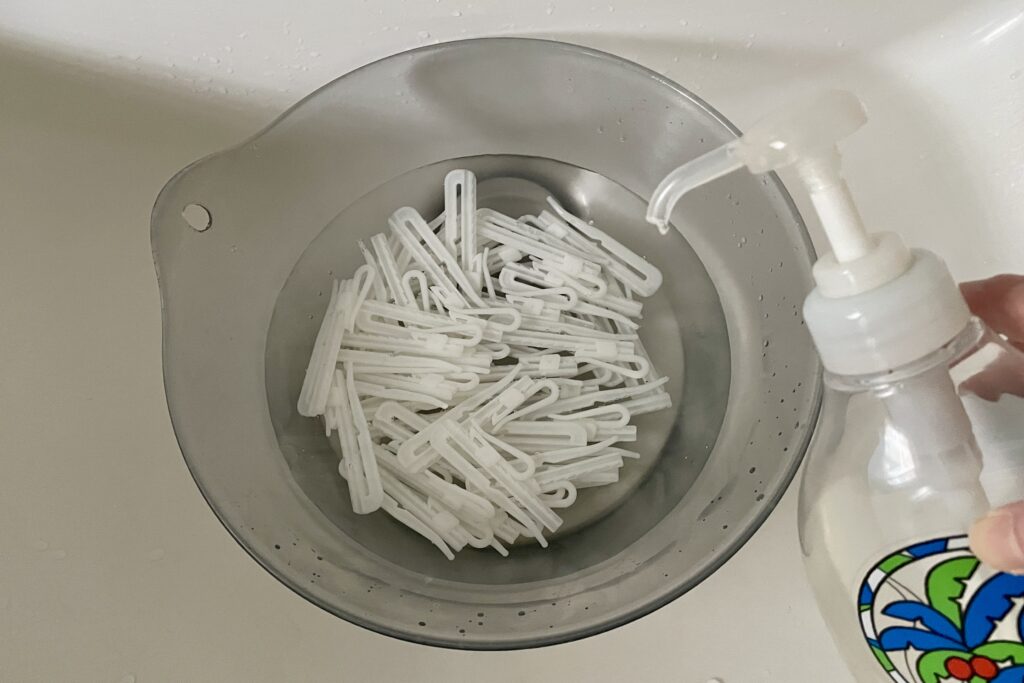 洗面器などに水かぬるま湯を入れて中性洗剤(今回は中性の台所洗剤を使用しました)を1プッシュくらい加えて、その中にフックをつけておきます。