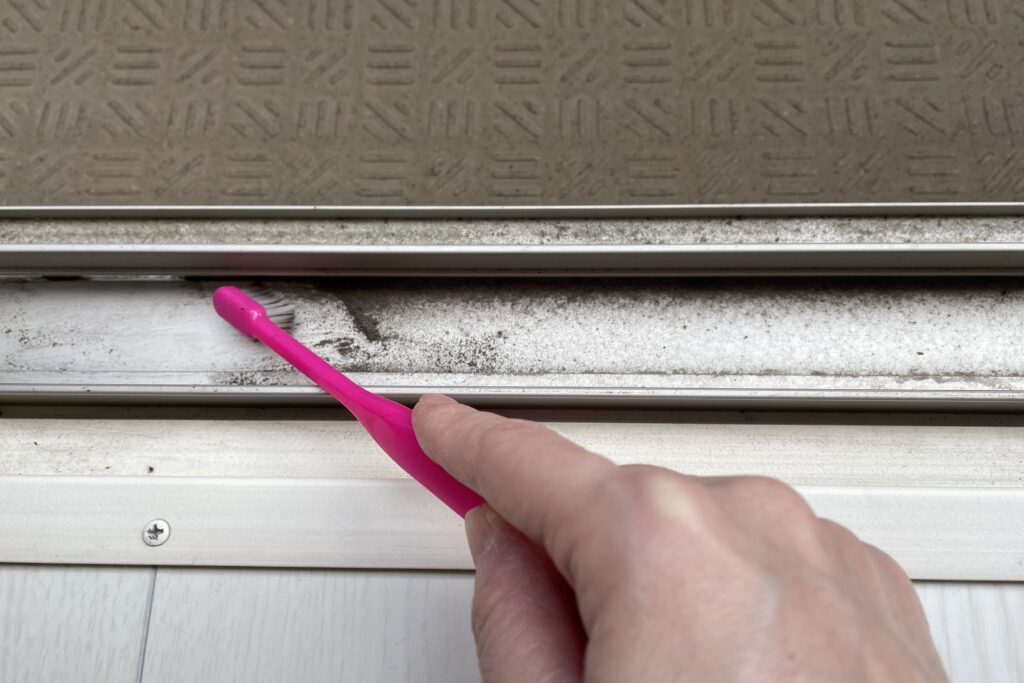 サッシを乾いた歯ブラシで擦ってこびりついた汚れを浮かします。